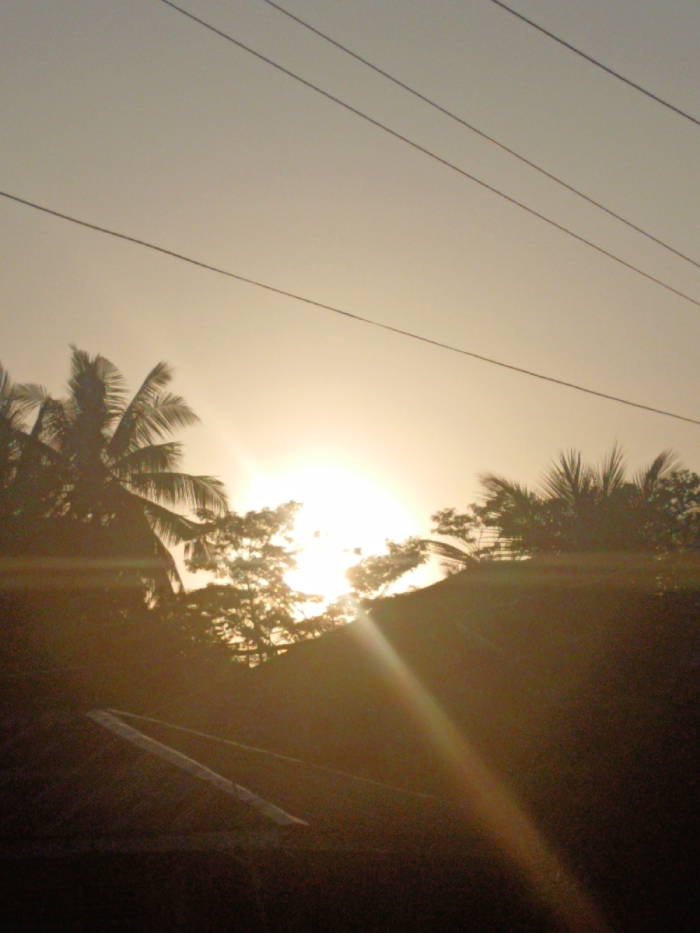 The image displays an outdoor scene in Teupinjok, Indonesia, illuminated by direct, low-angle sunlight, indicative of either sunrise or sunset