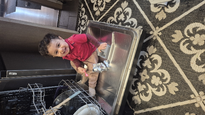 - "An indoor scene features an infant seated on the fully extended lower rack of an open dishwasher" by FM-IS3x72, licensed under CC BY 4.0