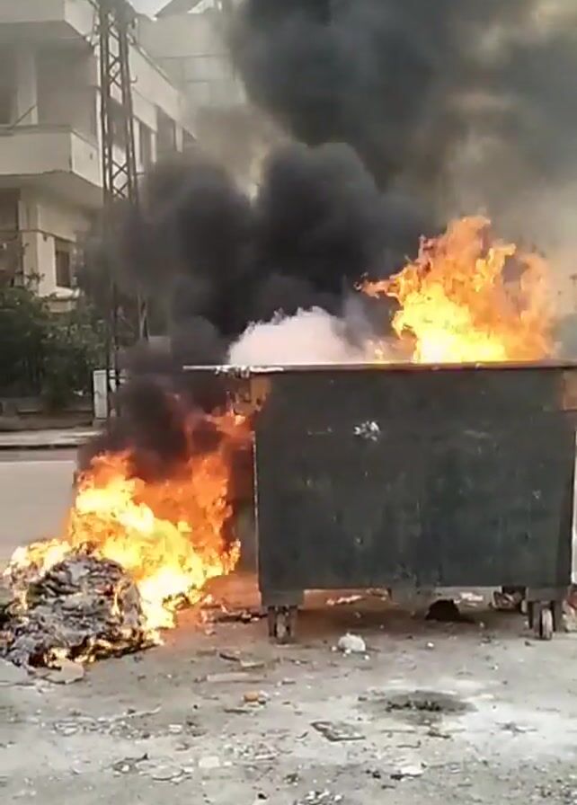 large metal dumpster engulfed in flames, both inside and in front of it. Thick black smoke billows upwards, obscuring the surrounding urban environment. A building and a utility pole are visible in the background. The dumpster sits on a street, and debris is scattered around the burning trash.