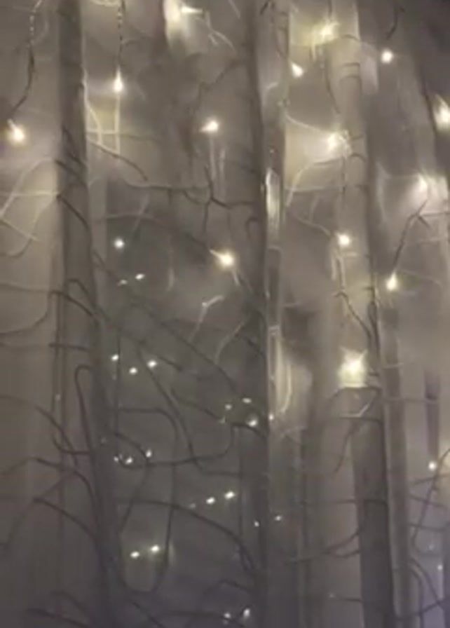 close-up of a sheer, white curtain adorned with small, warm white fairy lights