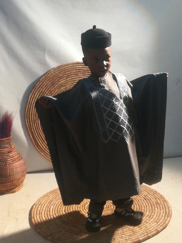 An indoor, studio-like scene depicts a young male child, approximately 3-5 years old, standing upright in the city of Unknown, Unknown. The child, of apparent African descent, is centrally positioned, looking forward with a neutral expression. He wears a dark grey, oversized traditional robe (agbada) featuring intricate white geometric embroidery on the chest and shoulders, dark trousers, and black and white sneakers. A black, cylindrical cap (fila) with a small knob adorns his head. He holds the sides of his robe outwards. The setting includes a light-colored, draped fabric background and a light-colored floor. On the floor, a circular woven straw mat is beneath the child, with a larger similar mat positioned behind him. To the left, a reddish-brown and beige woven vase contains purple, feathery plumes. Strong directional lighting from the upper left casts distinct shadows on the background and floor.