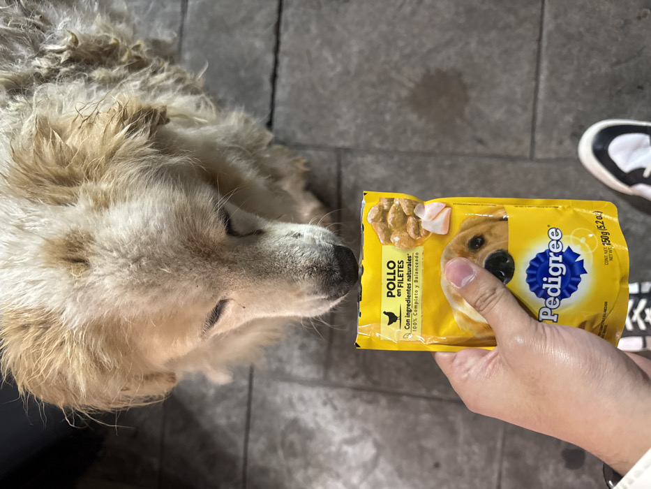 A fluffy, light-colored dog with closed eyes is positioned next to a yellow packet of Pedigree dog food. The packet features a photo of a dog on the front, along with the Pedigree logo and the words "POLLO en FILETES" (Chicken Fillets) written in Spanish. A hand is holding the packet in front of the dog's face, appearing to offer it. The scene is set on a gray stone surface. A partial view of a black and white sneaker is visible in the background.