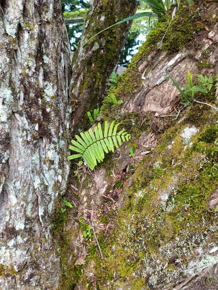 The image depicts a close-up view of two substantial tree trunks, heavily colonized by vegetation, observed within the city of Ambositra, Madagascar. The left trunk exhibits deeply furrowed, light grey bark with prominent patches of white and pale green lichen. The right trunk, and the crevice between the two, are extensively covered in vibrant green moss and darker lichen. A distinct, bright green fern frond with numerous small leaflets extends horizontally from the central crevice, positioned slightly to the left of the image center. Several smaller fern fronds and various tiny green plants are scattered across the mossy surfaces and within the crevices. Scattered brown leaf litter and detritus are visible at the base of the vegetation and within recesses of the bark. In the upper background, through a gap in the foliage, a blurred reflection of light on a body of water is discernible. No people, animals, or man-made objects are present in the immediate foreground.