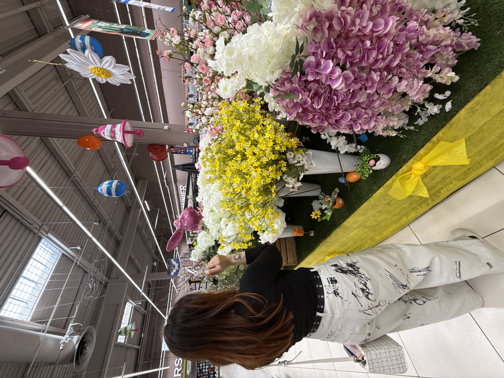 The scene depicts the interior of a large retail store, specifically identified as a Carrefour hypermarket in Geispolsheim, France, based on visible signage fragments. A female individual with long, dark brown hair displaying reddish undertones is shown from behind, facing a prominent display of artificial flowers. She wears a black long-sleeved top, white wide-leg trousers adorned with black abstract patterns, and a black studded belt. A small, dark tattoo resembling an animal head is visible on her left forearm. She carries a light-colored, woven handbag on her left arm and appears to be examining an item within the flower display, holding a small, indistinct object in her raised right hand. The central display consists of a large arrangement of artificial flowers, including bright yellow clusters, white hydrangea-like blooms, light pink cherry blossom branches, and cascading purple wisteria-like garlands. These are presented in white vases and buckets on a green artificial turf platform, edged with bright yellow fabric. Scattered on the turf are decorative elements such as miniature pots of artificial daisies and plastic Easter eggs in orange, blue, and striped patterns. Overhead, the store ceiling features large skylights, metal ventilation ducts, fluorescent lighting, and security cameras. Festive Easter-themed decorations, including large striped blue and white eggs, pink and white bells, an orange egg, a prominent white daisy, and a large pink bunny figure, are suspended from the ceiling. In the background, sections of retail shelving with merchandise and a red fire hose reel on a pillar are visible.