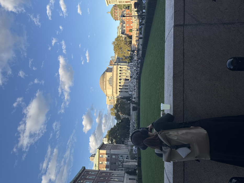 An elevated, eye-level outdoor photograph depicts a bustling university campus scene under a clear blue sky with scattered white cumulus clouds. The foreground features the upper surface of a granite-colored stone wall, upon which a clear plastic cup containing a light yellow liquid rests to the right. A person, viewed from the back, occupies the left foreground, leaning on the wall with forearms visible. This individual has dark hair styled in a ponytail, wears over-ear headphones, a dark-colored long-sleeved garment, and a tan roll-top backpack. Beyond the wall, a large, rectangular, well-maintained green lawn occupies the midground. A paved walkway borders the far side of the lawn, leading to a grand set of steps. Numerous individuals are visible on these steps and congregating on the plaza leading up to a prominent classical building. The central background is dominated by the Low Memorial Library of Columbia University, located in Morningside Heights, New York City, United States. This architectural landmark features a large, light-colored stone facade with a grand portico of classical columns and a prominent dome. To the left of Low Library, a multi-story brick building with multiple windows and a green-hued roofline is visible, characteristic of Butler Library. To the right of Low Library, other campus buildings are present, including one with a smaller, dark-domed structure (possibly Philosophy Hall). Scattered trees with green foliage are visible throughout the campus grounds. The scene suggests late afternoon lighting with long shadows.