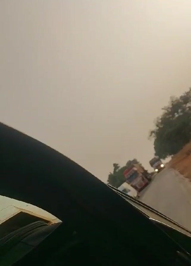 car driving on a road with several trucks ahead. The sky is overcast. The road is narrow, bordered by trees and a reddish-brown shoulder. The view is partially obstructed by the car's frame. In the driver's side mirror, a hand with a bracelet can be seen.