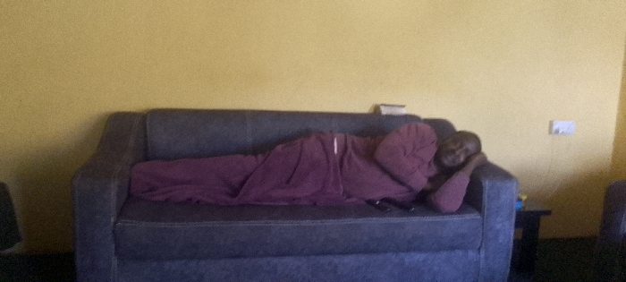 - "Within an indoor area, specifically a room with a plain, light yellow-gold wall, a dark-skinned adult individual is depicted lying on their left side on a dark grey upholstered sofa" by FM-3ChFr2, licensed under CC BY 4.0