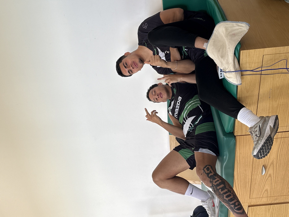 Two males are depicted seated on a green-cushioned wooden bench within an indoor room in Las Crucitas, Mexico. The background consists of a plain white wall. The individual on the left, with dark hair and light skin, is reclined on the bench. He is wearing a black sleeveless athletic top with green and white design elements, including a 'Mazda' logo. He wears black shorts with green and white stripes, white Nike socks, and white athletic shoes with red accents. A large, dark-inked tattoo is visible on his right thigh. His left arm is bent, and his hand is raised, displaying an extended index finger and pinky finger gesture. His right hand rests near his abdomen. The individual on the right, also with dark hair and light skin, is seated more upright on the bench. He is wearing a black short-sleeved athletic shirt, black athletic pants, and white socks. A thin gold-colored bracelet is visible on his left wrist. His right foot is enclosed within a tan-colored padded boot or wrap from which blue wires emerge. His left arm is bent, and his hand is raised, displaying an extended index finger and pinky finger gesture. His right arm rests on his lap. Both males are looking towards the camera. The wooden structure supporting the green bench cushion contains multiple drawers equipped with silver-colored pull handles.