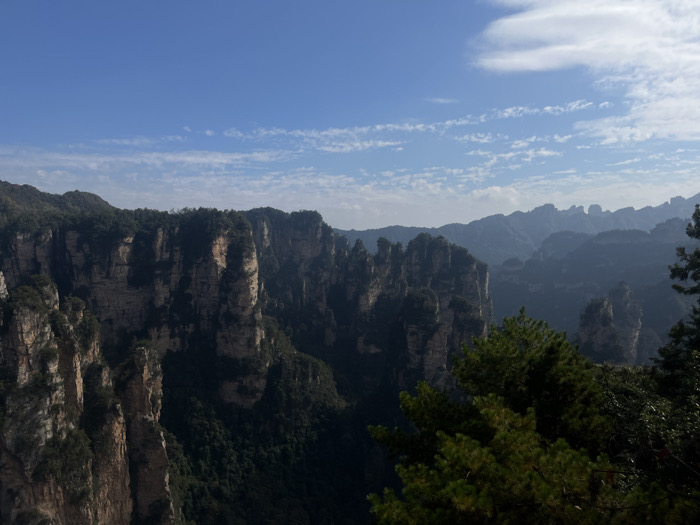 Towering rock formations dominate the landscape under a blue sky with scattered clouds. Lush greenery clings to the sides and tops of these natural pillars, creating a stark contrast between the gray rock and vibrant vegetation. Distant mountains fade into a hazy horizon, adding depth to the vista. Trees in the foreground partially obscure the view, adding a sense of being within the scene. The overall atmosphere evokes a sense of grand scale and natural beauty.