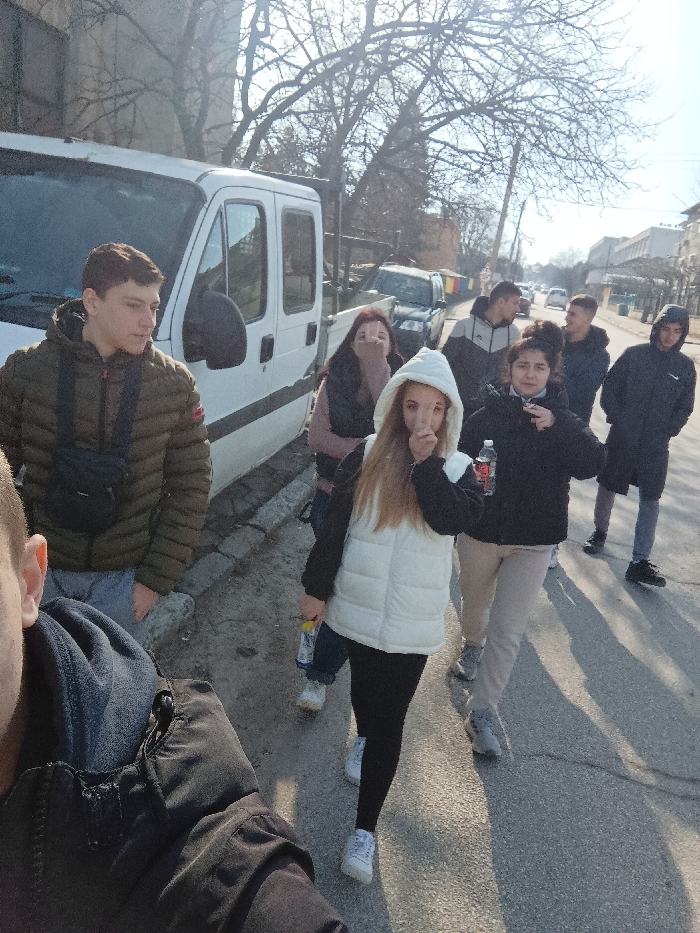 The image depicts a group of seven young individuals standing on a paved street in Cherven Bryag, Bulgaria, on a clear, sunny day
