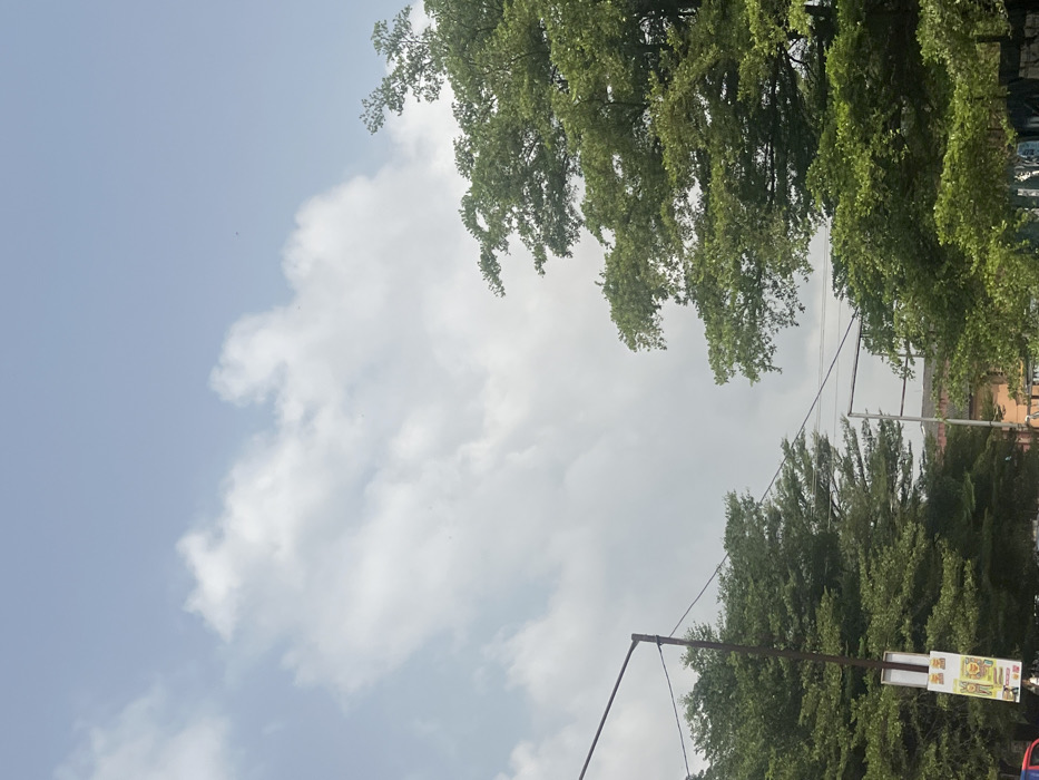 The scene, located in Ijanikin, Nigeria, depicts an outdoor environment under a partially cloudy sky. The upper two-thirds of the frame show a light blue sky with scattered white cumulus clouds. Dense green foliage from two distinct trees frames the lower portion, with one tree on the far left and a larger, more prominent tree on the right. A dark, vertical utility pole stands on the left, supporting a white rectangular sign displaying yellow and red graphic elements. Multiple thin, dark utility wires stretch horizontally across the mid-ground, connecting to this pole and a second, less distinct dark utility pole situated further back and towards the right. Between the trees and infrastructure, distant, indistinct buildings with reddish-brown and lighter facades are partially visible. No individuals or specific actions are observed.