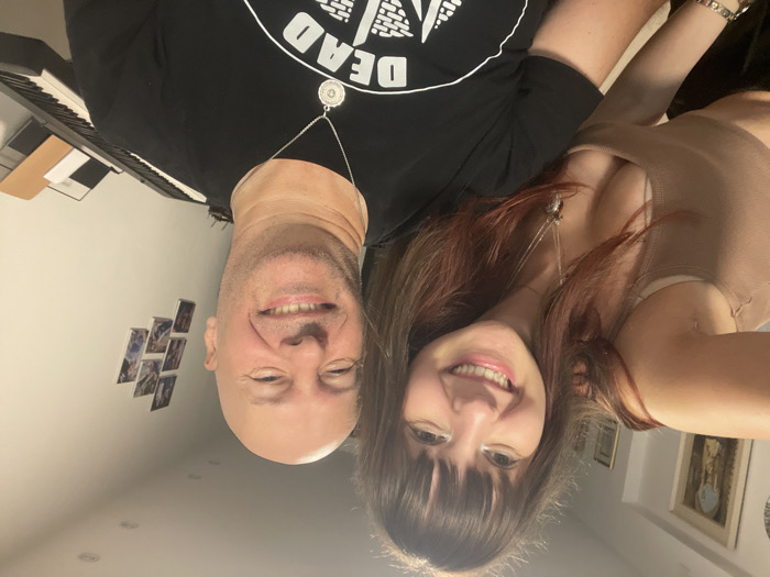 Two smiling individuals, an adult female and an adult male, are depicted in an indoor setting. The female, positioned on the left and slightly behind the male, has long brown hair with bangs and reddish highlights, wearing a light brown low-cut top, a silver necklace with a circular pendant, and a bracelet on her left wrist. The male, in the foreground, is bald, wearing a black t-shirt with a partially visible white graphic that includes the text 'DEAD', and a silver necklace with a circular pendant. Both subjects are looking directly at the camera. The background features light-colored walls. A partially visible framed picture with a stylized figure is present on the left wall. A diagonal arrangement of five smaller framed pictures is displayed on the right wall. A black digital piano or keyboard with white keys and sheet music on a stand is visible in the background to the right. Recessed circular lights are visible on the ceiling. The precise location within Raanana, Israel, is not ascertainable from the visual evidence provided.