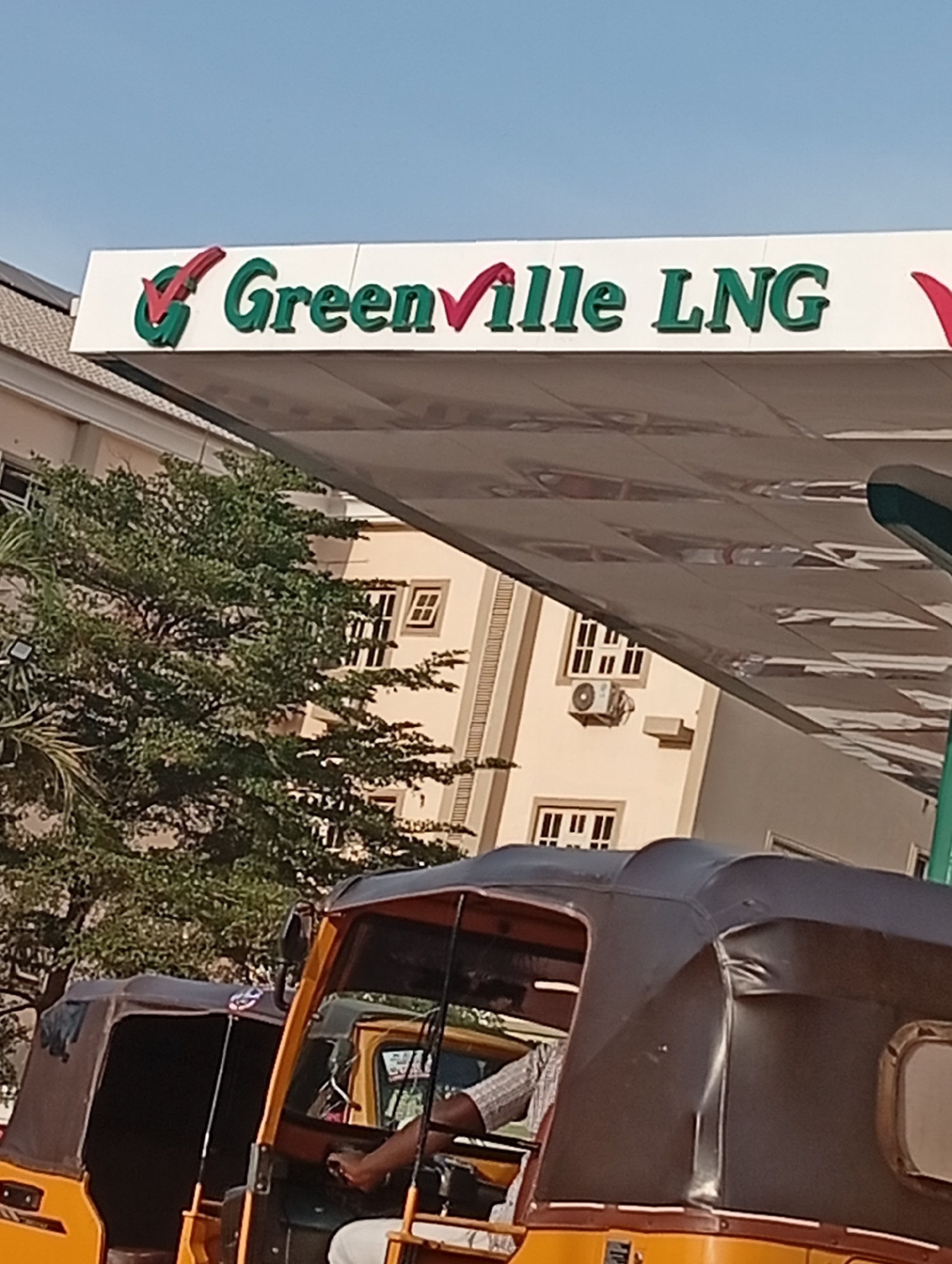 The image depicts a GreenVille LNG fueling station in Television, Nigeria