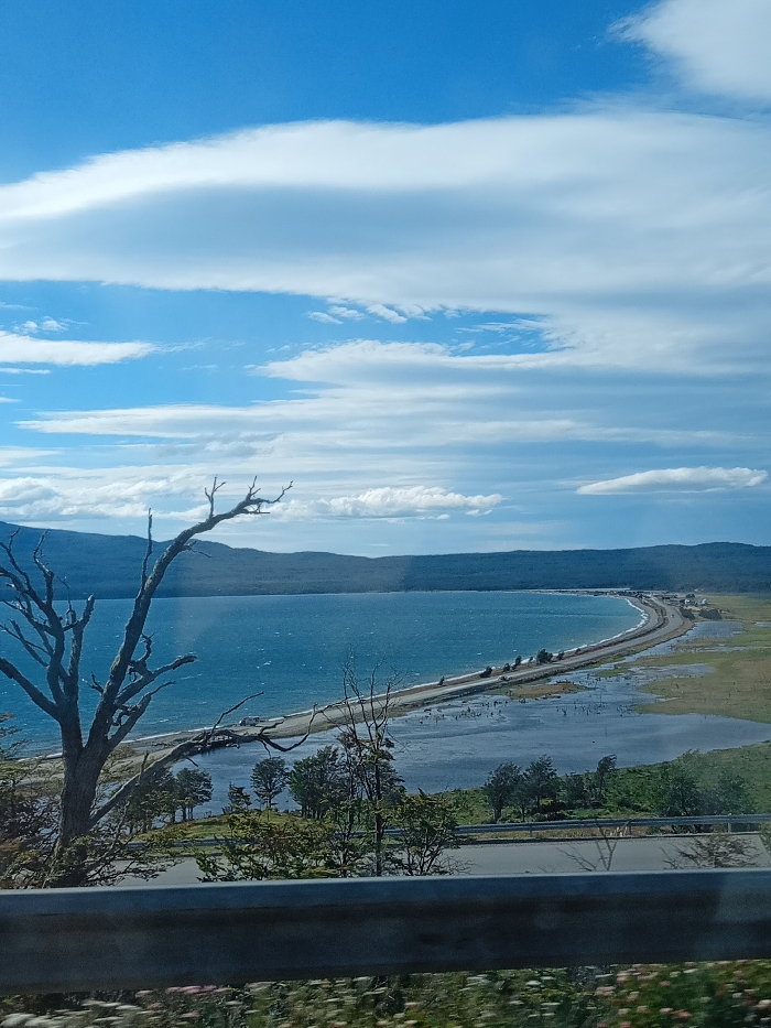A scenic view captures a long, narrow road extending into a body of water, framed by mountains in the distance under a sky with scattered clouds. An old, leafless tree stands prominently on the left, while patches of vegetation and greenery add depth to the foreground. The roadside is visible in the immediate foreground.