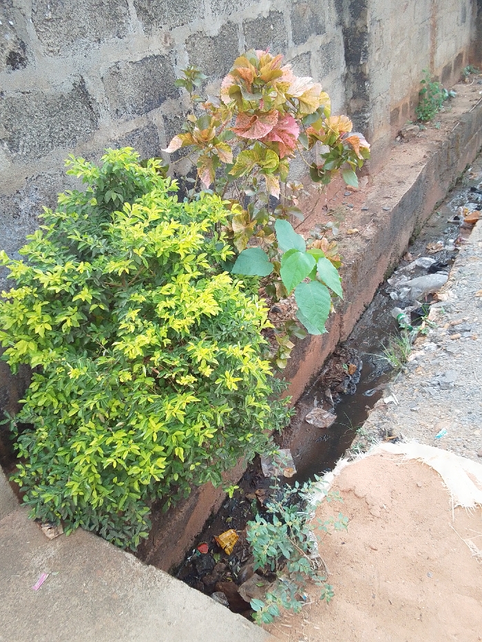 A vibrant green bush thrives beside a brick wall and a concrete gutter. A multi-colored plant with shades of green, pink, and yellow rises behind the bush. The gutter is filled with water, debris, and weeds. A pile of dirt is contained by a white sack near the gutter's edge. The composition depicts an unkempt space, where nature perseveres amid neglect.