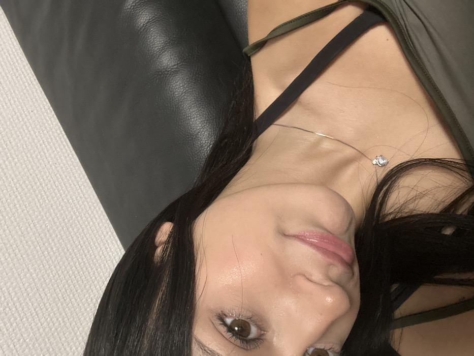A close-up, angled indoor portrait captures a young female subject. Her head is tilted to the viewer's right, with her gaze directed towards the camera. She presents with long, dark hair, brown eyes, clear skin with a subtle blush, and glossy pink lips, exhibiting a slight smile. She wears an olive-green camisole or tank top. A black strap, likely from an undergarment, is visible over her left shoulder. Around her neck is a thin, silver-colored chain necklace with a small, faceted, clear pendant. The subject is situated on a black, likely leather or faux leather, cushioned surface. Behind her head, a light-colored, textured wall is visible. The image provides no specific visual cues to identify the location as Strasbourg, France.