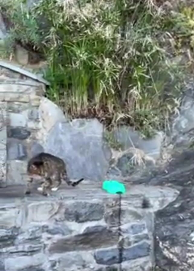 A short video shows a tabby cat walking across a stone retaining wall to a bright green bowl. The cat's coat is brown, black, and white. The cat has a skinny body and a relatively short tail. The retaining wall is composed of flat gray rocks. Behind the wall are some tall green plants. Someone speaks Italian in the background.