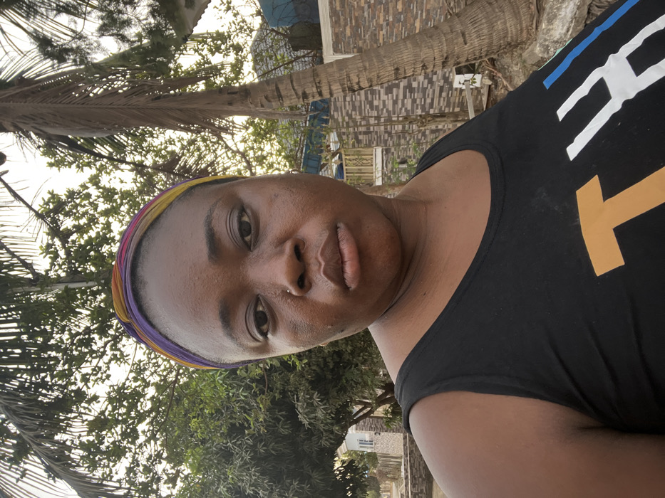 A person wearing a colorful headband and black tank top poses outdoors. The top features bold white and gold lettering. Palm trees and greenery are visible in the background, suggesting a tropical setting. The person has a nose piercing and is looking directly at the camera. The image is slightly rotated.