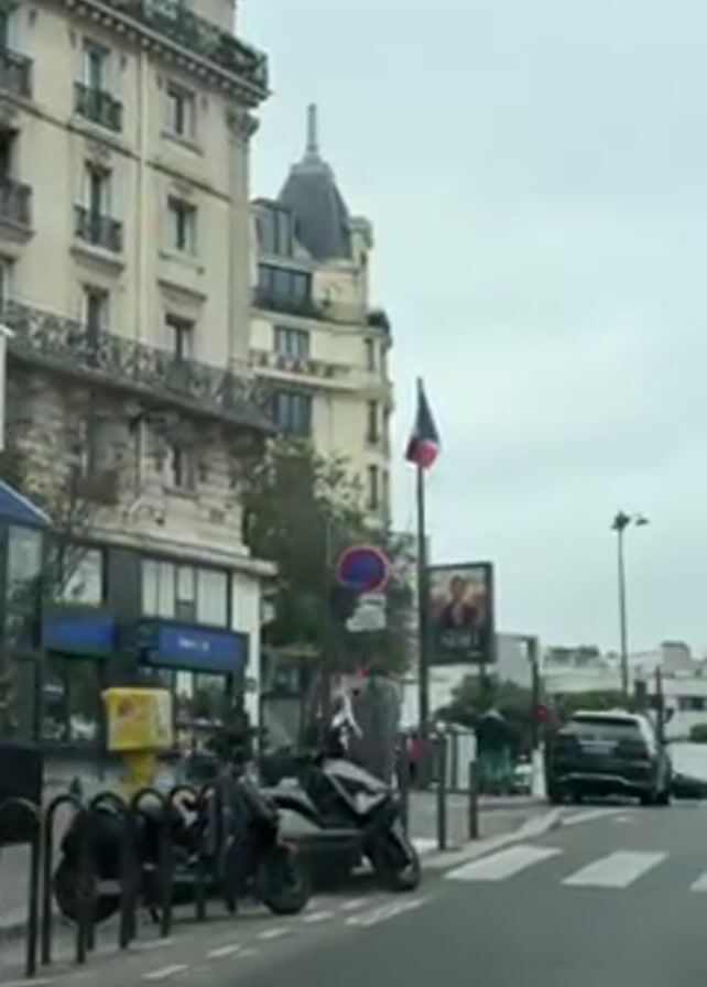 street scene in Paris on an overcast day. A tall, cream-colored building with multiple balconies and a small tower is visible. A French flag is flying next to the building. A street sign with red and blue markings and a poster for "Nero" can be seen next to the flag. A couple of people cross the street, and cars and scooters are parked and driving on the road. A building with the name "LE MAYDAY" is on the corner.