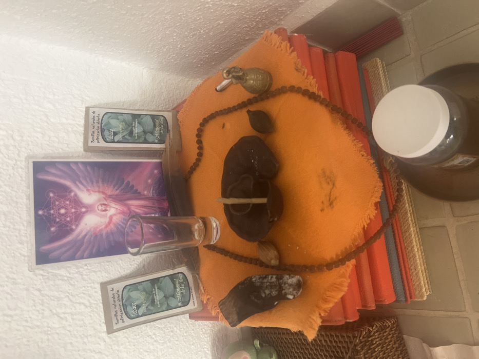 A small altar-like setup is displayed. A purple-toned angel picture, two packets of "Tabaco" seeds, and a small glass of liquid are positioned to the left. An orange cloth with a bead necklace draped across it anchors the center. A brown object with a stick protruding, a metal elephant figurine, and stones rest on the cloth. The altar sits atop a stack of books with colored covers. A jar with a white lid is on the right, and a woven basket is visible beneath the books.