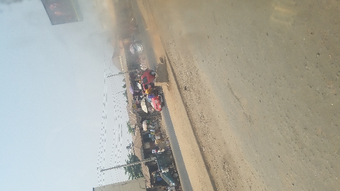 The image depicts an outdoor scene in New Karu, Nigeria, characterized by a dusty, unpaved foreground road leading to a paved street lined with commercial activity