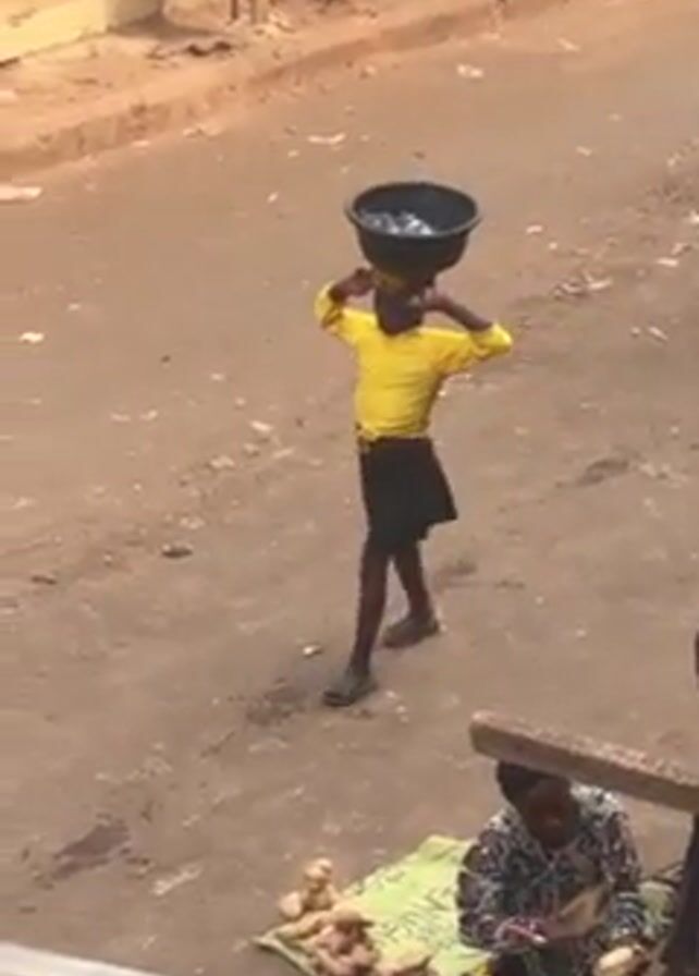 young girl walking along a dirt street. She is wearing a yellow shirt and a black skirt, with sandals on her feet. On her head, she is carrying a black bucket filled with what appear to be wrapped items. She uses her hands to balance the bucket as she walks. The background includes buildings, boxes, and a person selling what appears to be ginger. The scene seems to take place in a developing area or market.