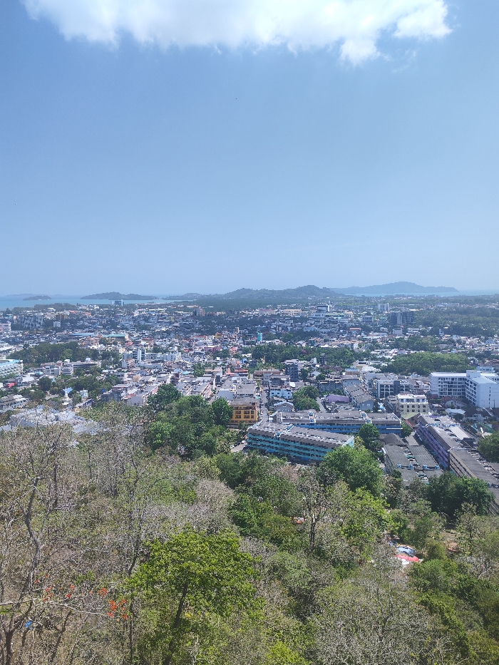 The image presents an elevated panoramic view overlooking the city of Ratsada, Thailand. The foreground consists of a densely vegetated hillside with a mix of deciduous trees exhibiting bare, light-colored branches and evergreen trees with full green foliage; sparse red blossoms are visible on branches in the lower left. The midground is dominated by the sprawling urban landscape of Ratsada, Thailand, characterized by numerous multi-story buildings in varying colors, including white, grey, yellow, light blue, and purple, densely packed and interspersed with areas of green tree canopy. A prominent white statue is visible within the city's left-central section. The background reveals a coastal expanse with light blue water and several small, green-covered landmasses. Beyond the coast, a range of green hills and mountains recedes into the distant horizon. The upper portion of the frame features a clear, light blue sky with a single, elongated horizontal band of white stratiform cloud. The scene is illuminated by bright daylight, and no individuals or specific actions are discernible.