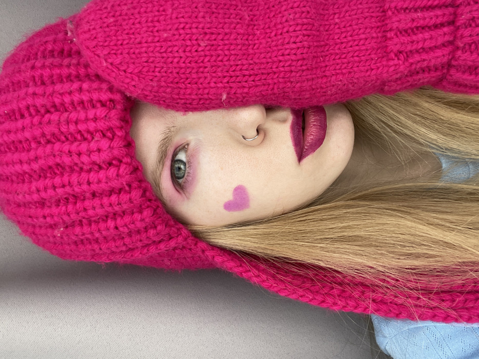 A close-up portrait features an individual, likely female, with fair skin, light blonde hair, and visible makeup. The left side of the face is prominent, showcasing a light blue eye with applied pink eyeshadow. A small, light purple heart shape is present on the left cheekbone, and a silver hoop nose ring pierces the left nostril. The lips are colored with deep magenta lipstick. The subject is wearing a bright, fuchsia pink knitted beanie with ear flaps, and a matching fuchsia pink knitted item, possibly a mitten, obscures the right side of their face. A light blue, textured garment is visible on the subject's left shoulder. The background is a plain, light grey, textured surface, indicating an indoor environment. The image contains no visual information to determine its specific location within the city of Izhevsk, Russia.