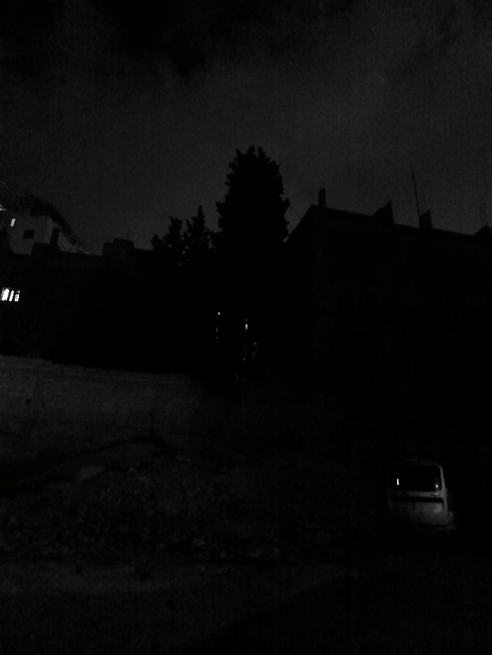 A dark, grainy image depicts a night scene with silhouetted buildings, a large tree, and a parked vehicle. The building on the left has windows illuminated. The foreground is indistinct, possibly showing uneven ground or debris. The sky is overcast. The overall composition is dark and lacks detail due to low light conditions.