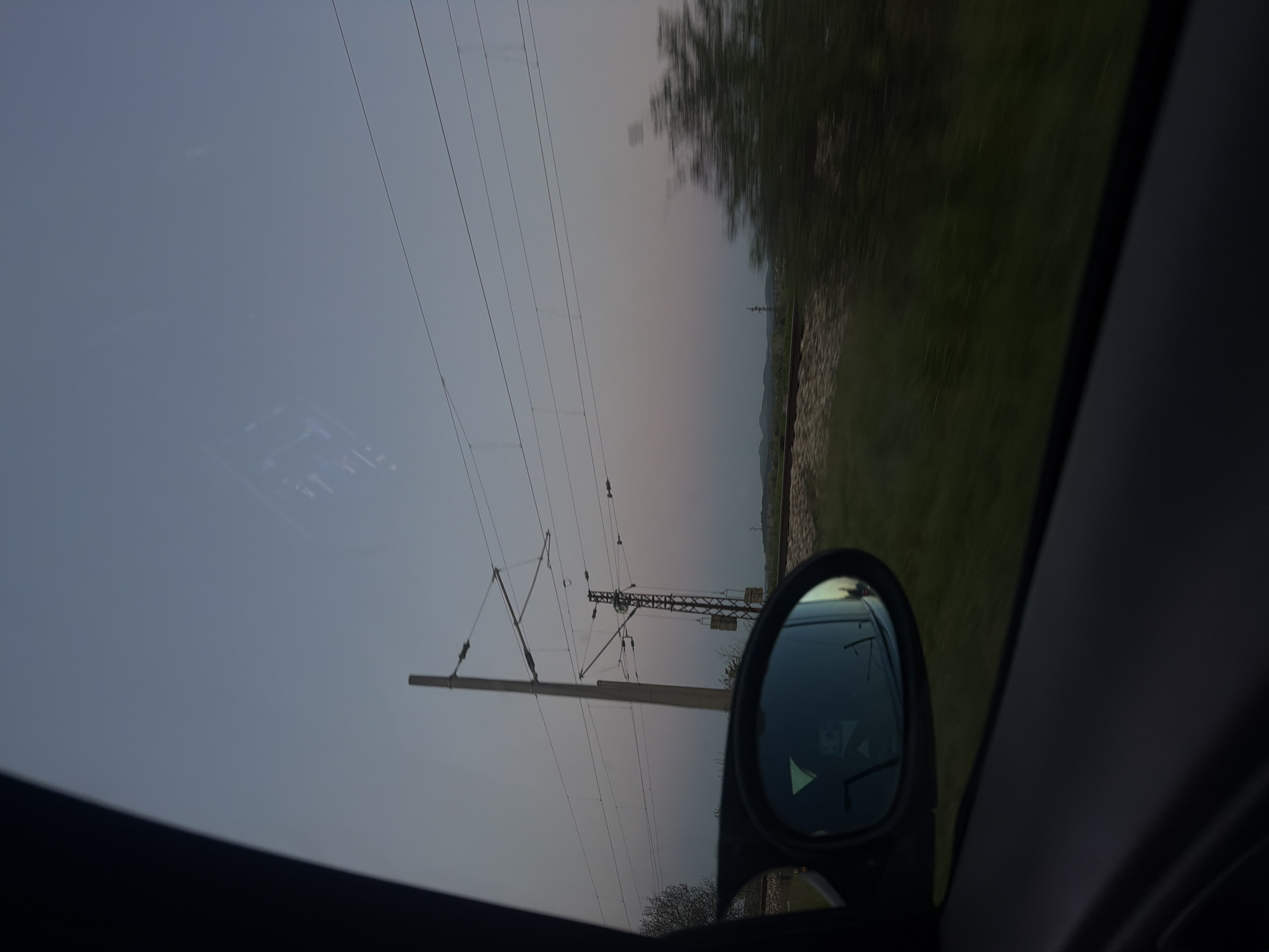 view from inside a vehicle, likely a car, with a side mirror visible. The scene outside the car depicts a landscape with power lines stretching across the sky. The sky appears to be a gradient of light blue to a pale orange-pink, possibly indicating sunrise or sunset. There is some vegetation visible to the right of the frame, along with what appears to be a railway track. The location is likely rural, suggested by the presence of power lines and greenery. While there is no visual confirmation of the Dalgopol, Bulgaria location, it can be inferred from the presence of railway lines and power lines, infrastructure commonly found in populated areas. No people are visible in the image. The reflection in the side mirror is unclear, but shows the presence of a vehicle. The action is movement, implied by the blurred scenery.