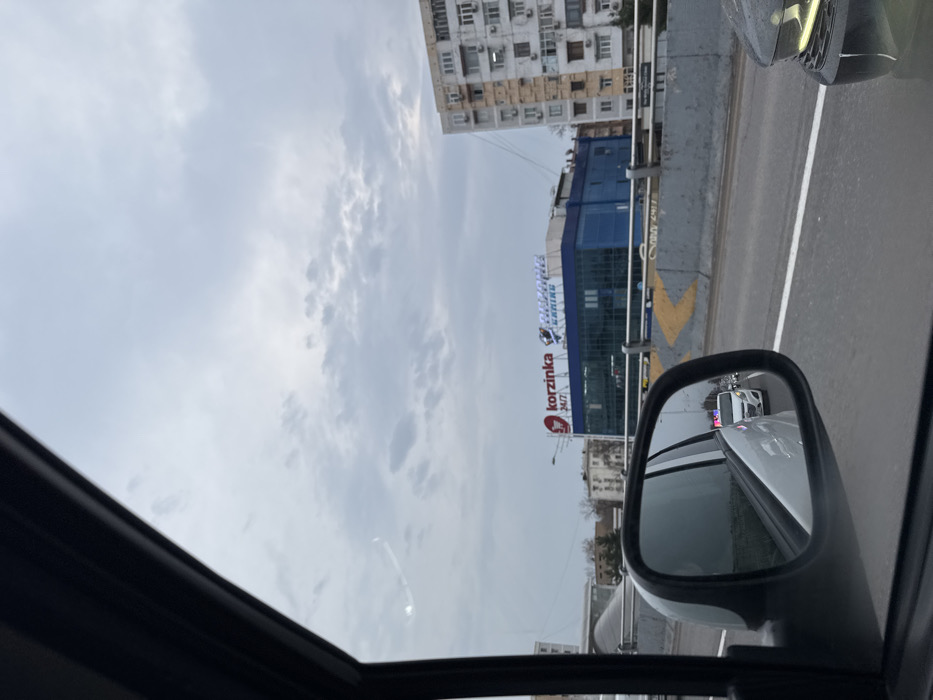 A roadside view from inside a car, the focus is on a building with a "korzinka 24/7" sign. Adjacent to it is a multi-story apartment building. In the car's side mirror, a police vehicle is visible. Overcast skies are seen above. The car's interior framework is in the foreground, and the image is slightly tilted.