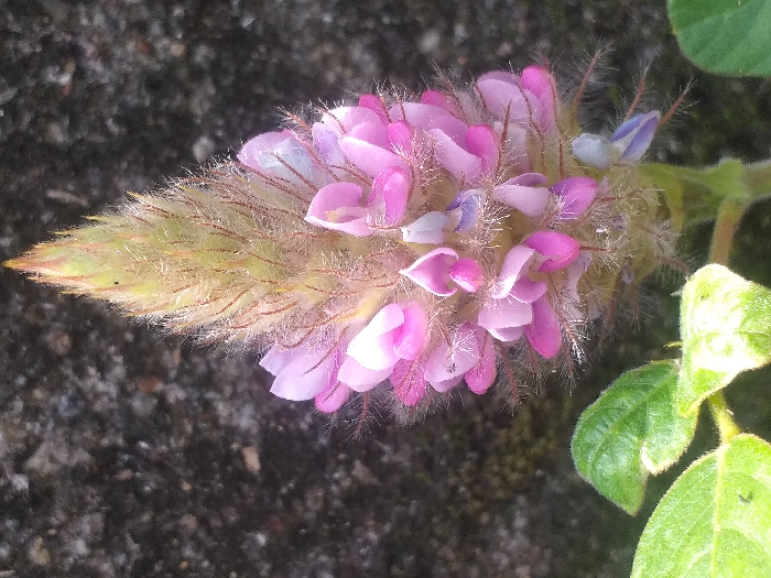 A close-up shows a flower cluster with a pointed, fuzzy, light-green-and-brown bract at the left end. Emerging from it are several pink and light-lavender flowers with downy hairs. To the right of the flower cluster are green leaves. The background is a dark, textured, mottled gray surface. The lighting is soft and indirect, with visible shadows.