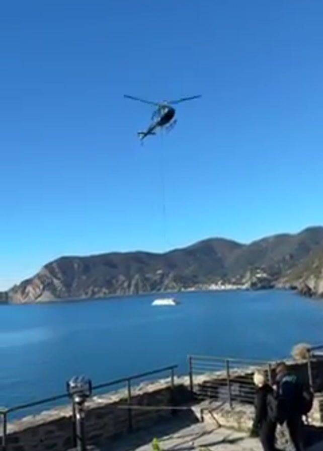 A helicopter is seen flying in a bright blue sky. Suspended by a long cable, the helicopter is carrying a large white package over the sea. The body of water is large and blue, with land visible in the background. The terrain in the background is hilly and covered with vegetation. In the foreground, there is a stone wall and a pair of people standing behind it. One of them is wearing a backpack. Also visible in the foreground is a coin-operated viewing scope.