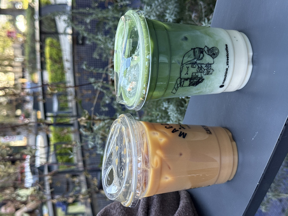 Two iced beverages, a matcha latte and an iced coffee, sit on a grey surface. The matcha latte, with a green upper layer and white base, features a logo. The iced coffee is a light brown color, containing visible ice cubes. Both drinks are in clear plastic cups with lids. A blurred outdoor background with greenery is visible.