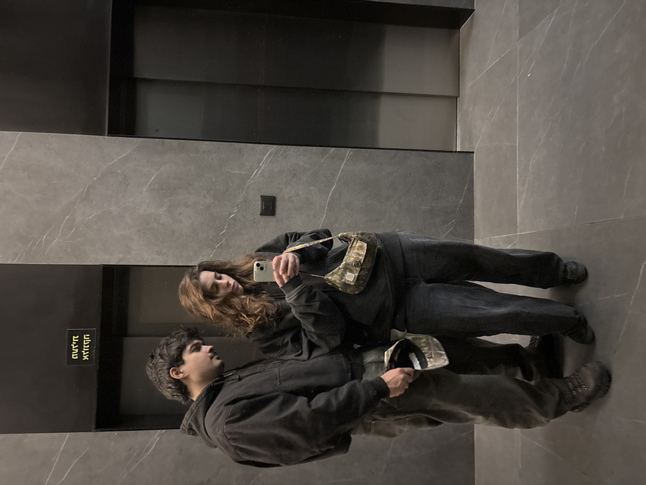 A couple stands in front of a large mirror in what appears to be a public space with marble-like walls. The woman holds a phone taking a picture of the reflection. She has long wavy brown hair, dark clothing and a camo bag. The man beside her wears dark clothes and holds a hat. Their images are reflected on the wall creating a doubled, mirror-like effect within the original image.
