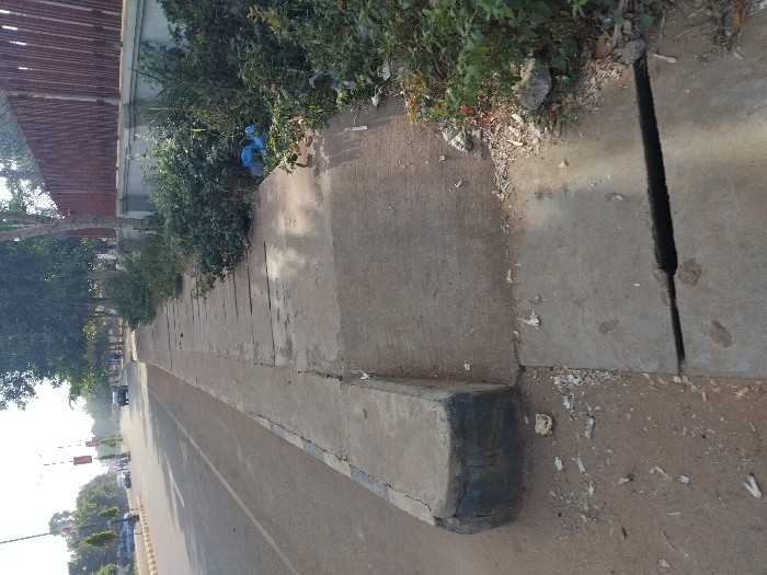 This image captures a daytime scene along a roadway in Shaba, Nigeria. The foreground presents a concrete sidewalk composed of rectangular slabs, exhibiting surface wear and multiple cracks, including a prominent linear fissure in the lower right. To the immediate left of the sidewalk is a raised concrete curb, partially painted dark gray. A dirt and sand shoulder, containing scattered light-colored debris, borders the curb. To the right of the sidewalk, a dense strip of green vegetation conceals blue plastic bags and other discarded refuse. The midground features a multi-lane asphalt road with vehicles, including a dark-colored SUV, visible in the distance. Along the right edge, behind the vegetation, a reddish-brown slatted fence or wall is mounted atop a concrete base. Trees line both sides of the road and extend into the background. Red and white banner-like structures are suspended over the road in the far left background. No individuals are discernible within the immediate scene, nor are active interactions evident.