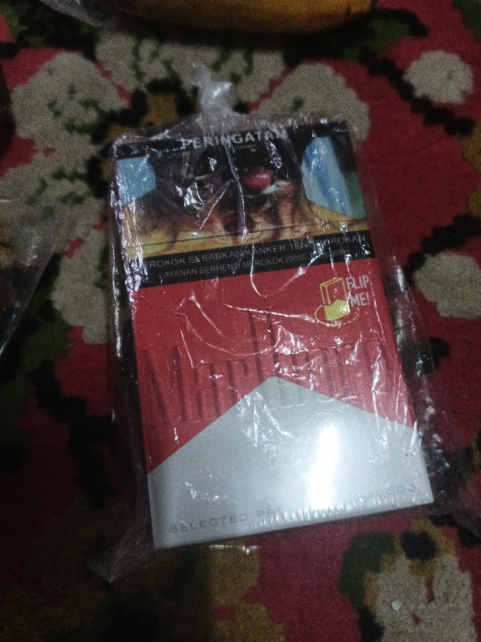 - "A retail-packaged Marlboro cigarette carton, still encased in its clear plastic wrapper, rests centrally on a patterned textile surface" by FM-4Pcj22, licensed under CC BY 4.0