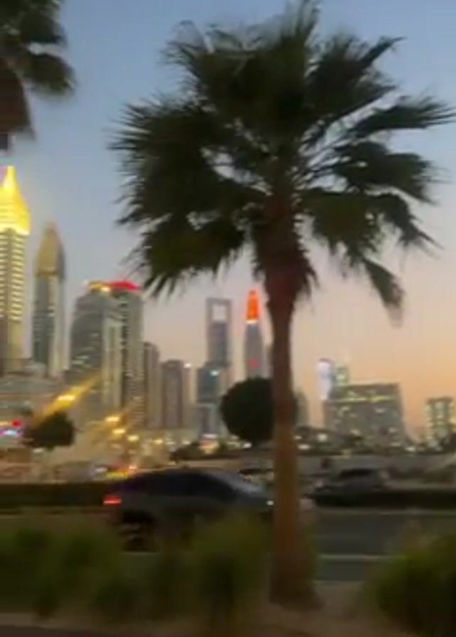 n urban landscape at dusk. Palm trees stand in the foreground, framing a skyline of tall buildings illuminated with various lights. Cars move along a road in the middle ground, and several people walk on the sidewalk. The sky is a gradient of blue and orange as the sun sets.