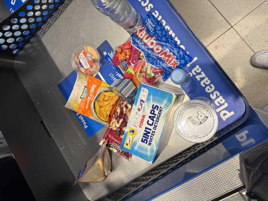 The image displays a collection of retail items placed on a supermarket checkout conveyor belt