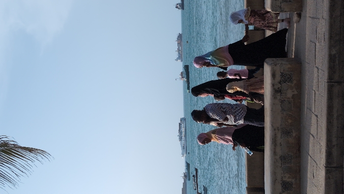 The image captures a clear, sunny day on the waterfront of Stone Town, Zanzibar, Tanzania. A light blue sky dominates the upper half of the frame, with a dark green palm frond partially visible in the top-left corner. The middle ground features the blue-green sea, where multiple vessels are present: a large white passenger ferry is prominent near the center, flanked by a smaller boat to its left and a tugboat to its right. A cargo ship is visible in the distant background, along with other indistinct vessels. In the foreground, a paved promenade runs parallel to the water, separated by a low, decorative stone retaining wall featuring recessed square patterns. A group of seven individuals—four adults and three children—walks along this promenade from left to right. From left to right: an adult woman in a pink hijab and dark clothing carries a plastic water bottle; an adult man in a patterned short-sleeved shirt; an adult woman in a black abaya and hijab walks near a young girl in a light-colored dress and hijab; and further right, another adult woman in a multi-colored hijab and black abaya holds the hand of a young girl in a patterned dress and white hijab. A young boy in a pink shirt is also part of the group, walking between the adults.