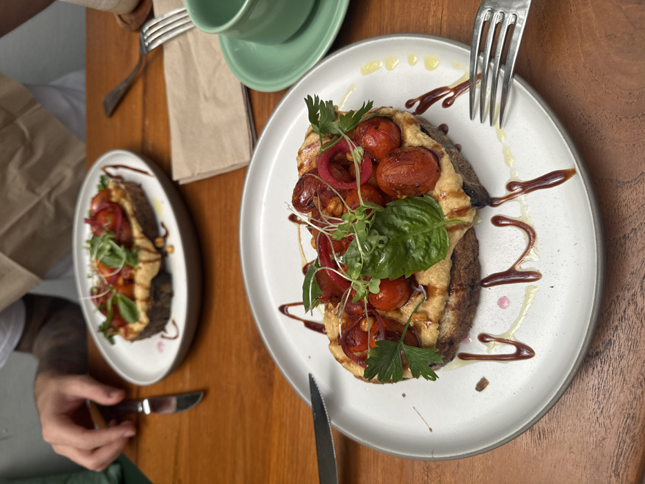 Two plates hold open-faced sandwiches. Dark bread is topped with a thick layer of hummus, roasted cherry tomatoes, pickled red onions, sprouts, basil, and parsley. Balsamic glaze and oil drizzle around the sandwiches on the plates. A green cup and saucer sit near one plate. A fork pierces the sandwich on the right, and a knife rests next to the plate on the left. The scene is set on a wooden table.
