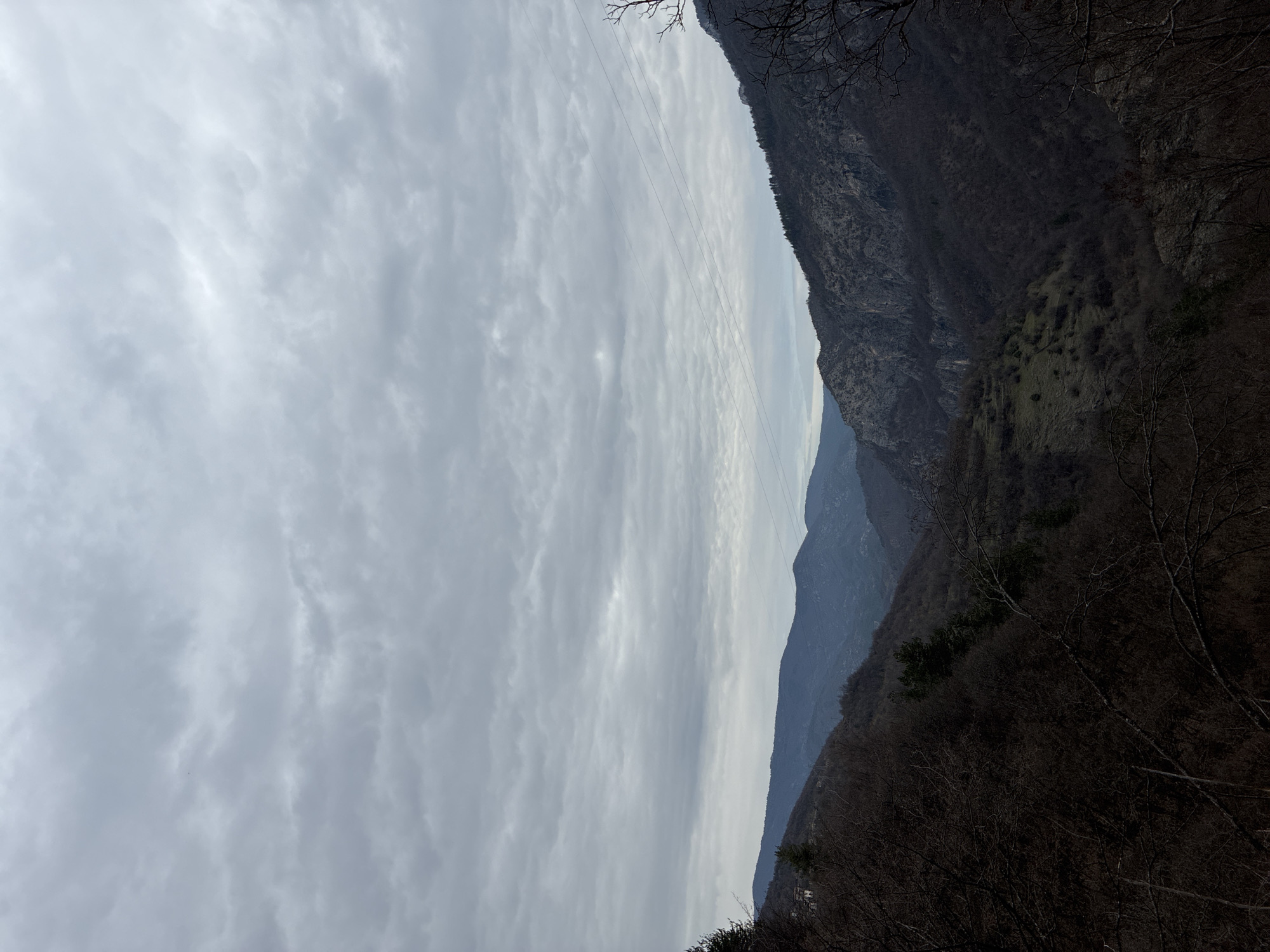 landscape in Yugovo, Bulgaria. A cloudy sky dominates the view. Multiple mountain ranges recede into the distance, with the closest range appearing dark and heavily wooded. Power lines are visible against the sky.