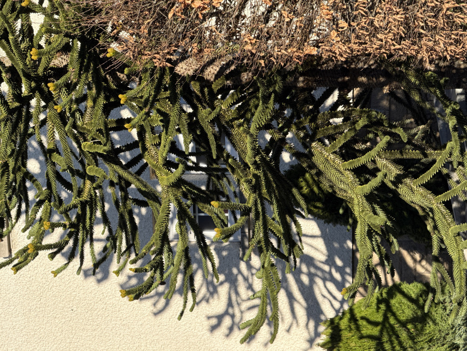 The image depicts an outdoor scene in Esch-sur-Alzette, Luxembourg, featuring dense vegetation against a building wall. A large Monkey Puzzle tree (Araucaria araucana) dominates the left and central portions of the frame, characterized by its stiff, dark green, scale-like leaves arranged spirally along its branches. Numerous yellowish-green, elongated male cones are visible at the tips of multiple branches. To the right, a deciduous tree or shrub stands with bare, brown branches still clinging to dried leaves, partially obscuring its trunk. The background consists of a light-colored, textured building wall, likely stucco or render, which features a white-framed window with multiple panes in its upper-middle section. A smaller, dense evergreen shrub is visible in the lower-left foreground. Strong, directional sunlight illuminates the scene, casting prominent, intricate shadows of the Monkey Puzzle tree's branches and foliage onto the building wall. No human figures or animals are present.