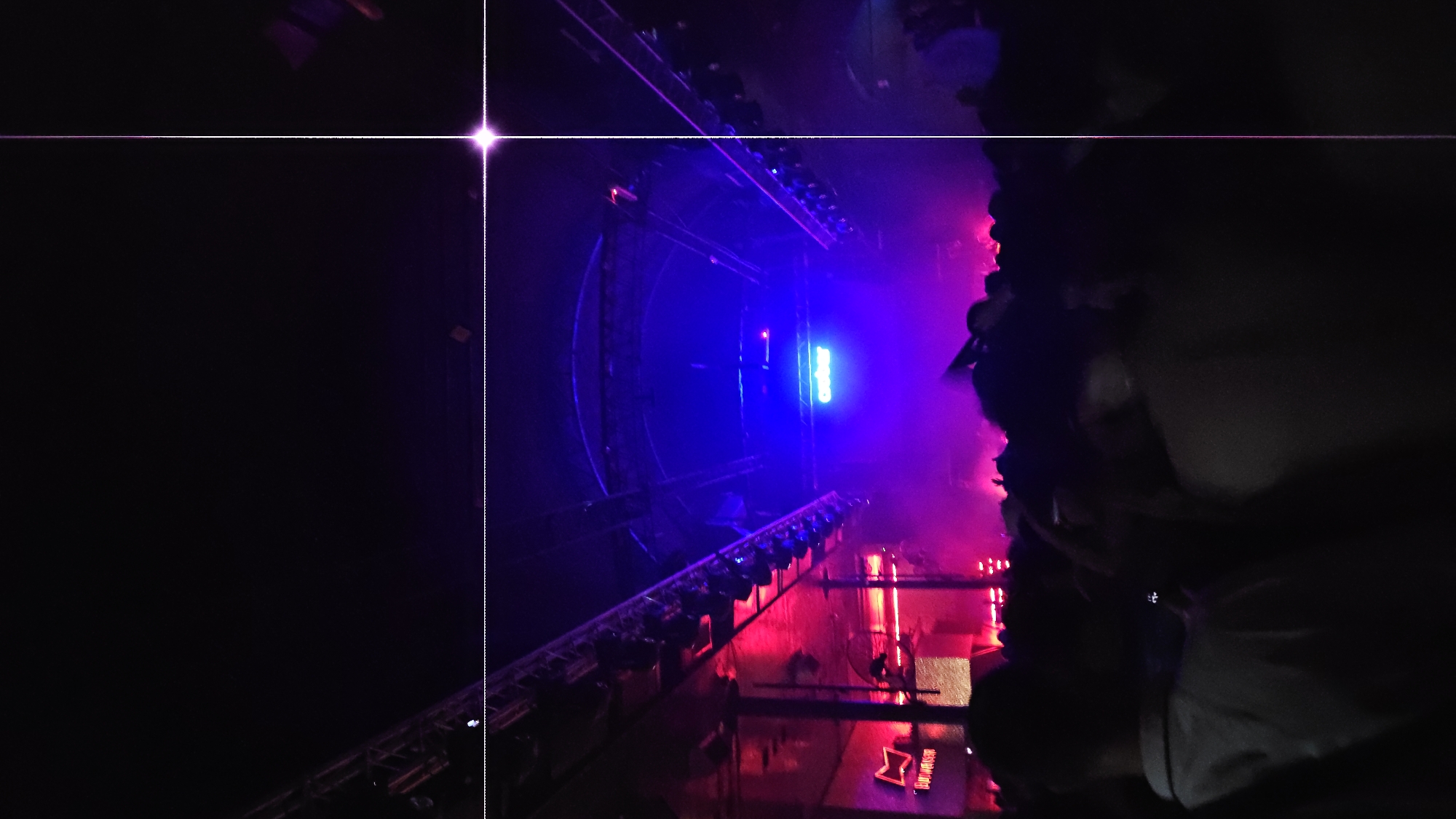The image captures the interior of Crobar Club, situated under the elevated highway in Palermo, Buenos Aires, Argentina, during a nighttime event. A dense crowd of numerous individuals occupies the foreground and middle ground, largely silhouetted and oriented towards a distant stage. The venue is characterized by low light conditions, dominated by vibrant blue and purple stage illumination emanating from the central performance area, which is partially obscured by haze. Overhead, exposed metal trusses support extensive lighting rigs. To the left, a section of the venue is brightly lit with red light, revealing vertical structural elements and a visible "BUDWEISER" neon sign or projection. A central blue neon sign, likely reading "CROBAR," is discernible on the stage. Attendees are observed standing, with some hands raised, and at least one individual in the immediate foreground is holding a mobile phone, possibly recording the event.