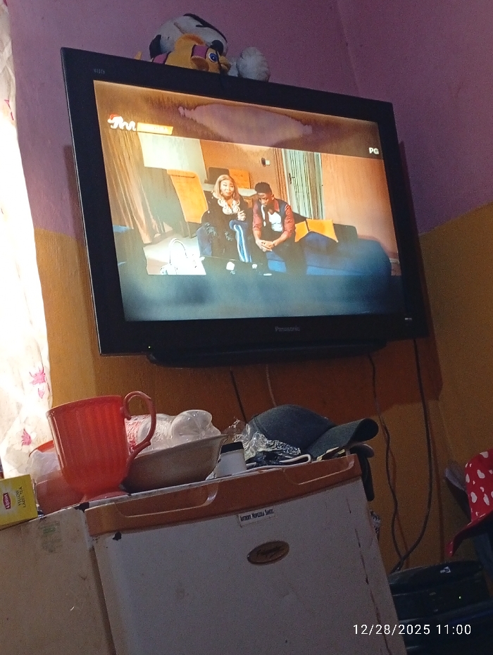 An interior shot depicts a room with a Panasonic flat-screen television prominently displayed, angled slightly downwards. The television screen shows a program featuring two individuals, a female with light-colored hair in a dark top, and a male in a light shirt with an open dark and red jacket, seated on a sofa within a studio-like setting. A "TN" channel logo and a "PG" rating are visible on the screen. Above the television, several plush toys are arranged, including a black and white figure and a yellow figure. Below the television, an off-white and orange-trimmed refrigerator or mini-freezer unit serves as a surface for various items. From left to right on this surface: a yellow Lipton tea box, a red plastic mug, a light-colored bowl containing clear plastic-wrapped items, and a dark baseball cap. Electrical cables are visible behind these items. A small section of a red and white polka-dotted item is visible on the far right, near a dark electronic device below the refrigerator. The room walls are painted in two horizontal sections: an upper light pink/purple hue and a lower yellow/orange hue. On the far left, a white translucent curtain with a faint floral pattern partially covers a window, allowing natural light into the space. The overall scene suggests a domestic environment in the city of Unknown, Unknown, recorded on 12/28/2025 at 11:00.