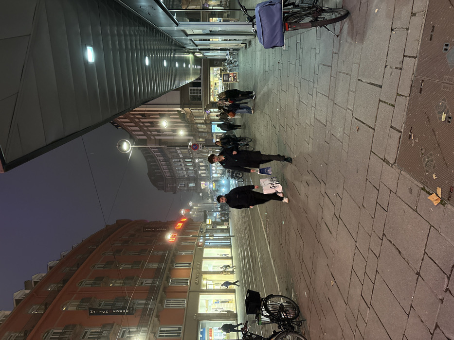 The image depicts a nighttime street scene in Strasbourg, France, specifically looking southeast on Rue de la Mésange from the vicinity of Place Kléber, with the Hotel Maison Rouge visible on the left. The scene is illuminated by artificial light sources including streetlights, building lights, and neon signs. The sky is dark blue-grey. The ground is paved with rectangular grey pavers, interspersed with several dark metal manhole covers and a few fallen yellow leaves in the foreground. On the left, a multi-story building, identified as Hotel Maison Rouge, features an orange-red facade with numerous windows and dormers on the roof. Its ground floor houses retail spaces with brightly lit window displays. "HOTEL" and "MAISON ROUGE" are prominently displayed in illuminated signage on the building. On the right, a modern building with a dark, overhanging canopy covers the sidewalk. Its ground floor consists of large glass storefronts reflecting streetlights and elements of the opposite side of the street. Approximately 15-20 individuals are present. In the immediate foreground, two males walk towards the viewer, slightly right of center. The individual on the left wears dark clothing and light-colored shoes, carrying a white shopping bag with "Galeria" printed on it. The individual on the right wears a dark coat and dark shoes, also carrying shopping bags. Further down the street, additional pedestrians are visible on both sidewalks. Several individuals are riding bicycles on the street in the mid-ground. Two bicycles are parked in the foreground; one on the left with a black basket on its rear rack, and one on the far right with a blue bag on its rear rack. Streetlights with circular white luminaires line the street. A red circular traffic sign with a diagonal white bar is visible on the right sidewalk further down the street. Vehicular traffic, indicated by illuminated headlights, is present in the distant background.