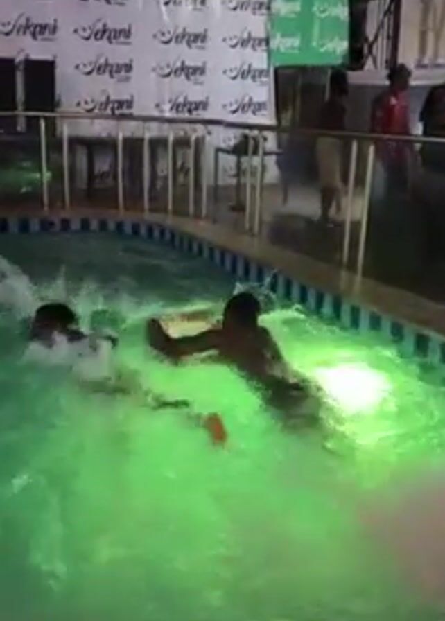 two shirtless people swimming in a bright green pool at night. A group of people is standing near the pool. The pool is lined with blue and white tiles and surrounded by a metal railing. Behind the pool, there is a wall with the word "Sekani" printed multiple times. There is also a white building with a window in the background. The pool water is visibly moving, suggesting active swimming. The overall atmosphere appears to be festive or recreational.