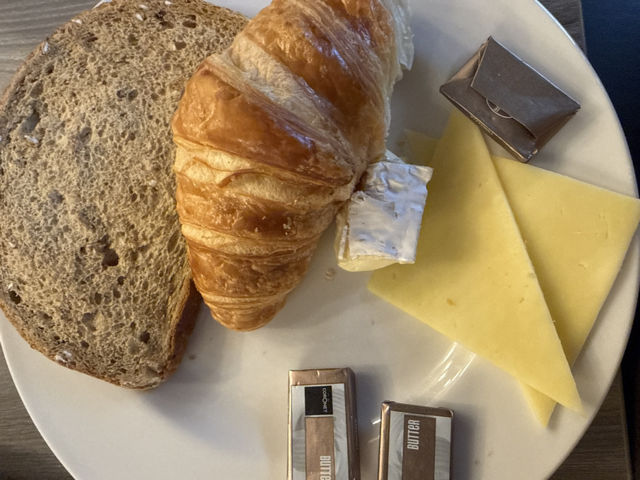 A white, curved-rimmed plate, situated on a light-colored surface, displays a breakfast assortment in the City of Edinburgh, United Kingdom. Positioned at the top of the plate is a single slice of dark, seeded bread. Below the bread, a golden-brown croissant is present, partially overlapping the bread and resting on a rectangular piece of white-rind cheese. To the left of the cheeses, two individually wrapped foil portions of butter are visible, one labeled "CORONET BUTTER". Two triangular slices of yellow cheese are stacked below the croissant and white-rind cheese. A small, opened brown paper packet, possibly containing a condiment, is located to the right of the yellow cheese. No individuals or active interactions are depicted.