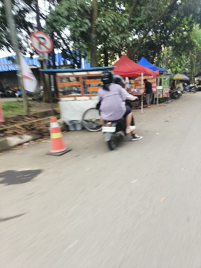 The image captures a blurred roadside scene in Cimahi, Indonesia. In the foreground, a dark-colored scooter carrying two helmeted individuals moves rightward on an asphalt road. The driver wears a light-colored, possibly lavender, long-sleeved top; the passenger is partially visible, wearing white shoes. On the left side of the road, an orange and white traffic cone is positioned near a mound of dark brown earth. A "No Parking" sign is mounted on a pole further left, behind which a white flag with a red emblem is visible. Along the right side of the road, a series of at least four hawker stalls are visible, topped with red, blue, green, and yellow canopies. A light-colored food cart with a glass display is prominent among these stalls, with a bicycle wheel leaning against it and plastic bottles on the ground. A male individual in a dark shirt and light shorts stands near the red-canopied stall. Multiple additional motorcycles are parked further down the road, which is bordered by numerous green trees.