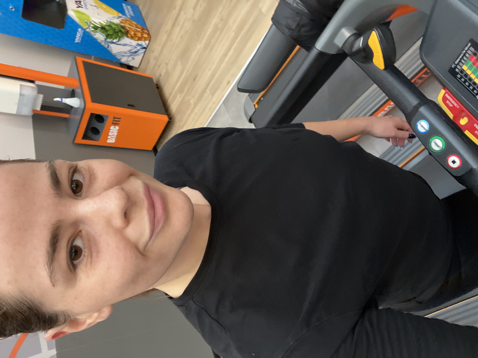 An adult female is depicted in a Basic-Fit gym located in Roubaix, France